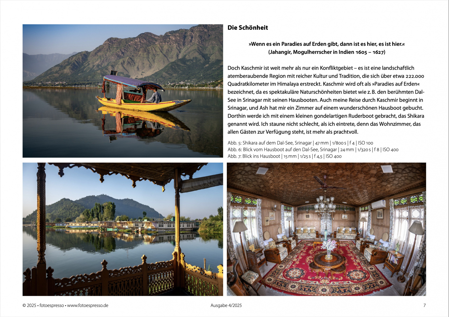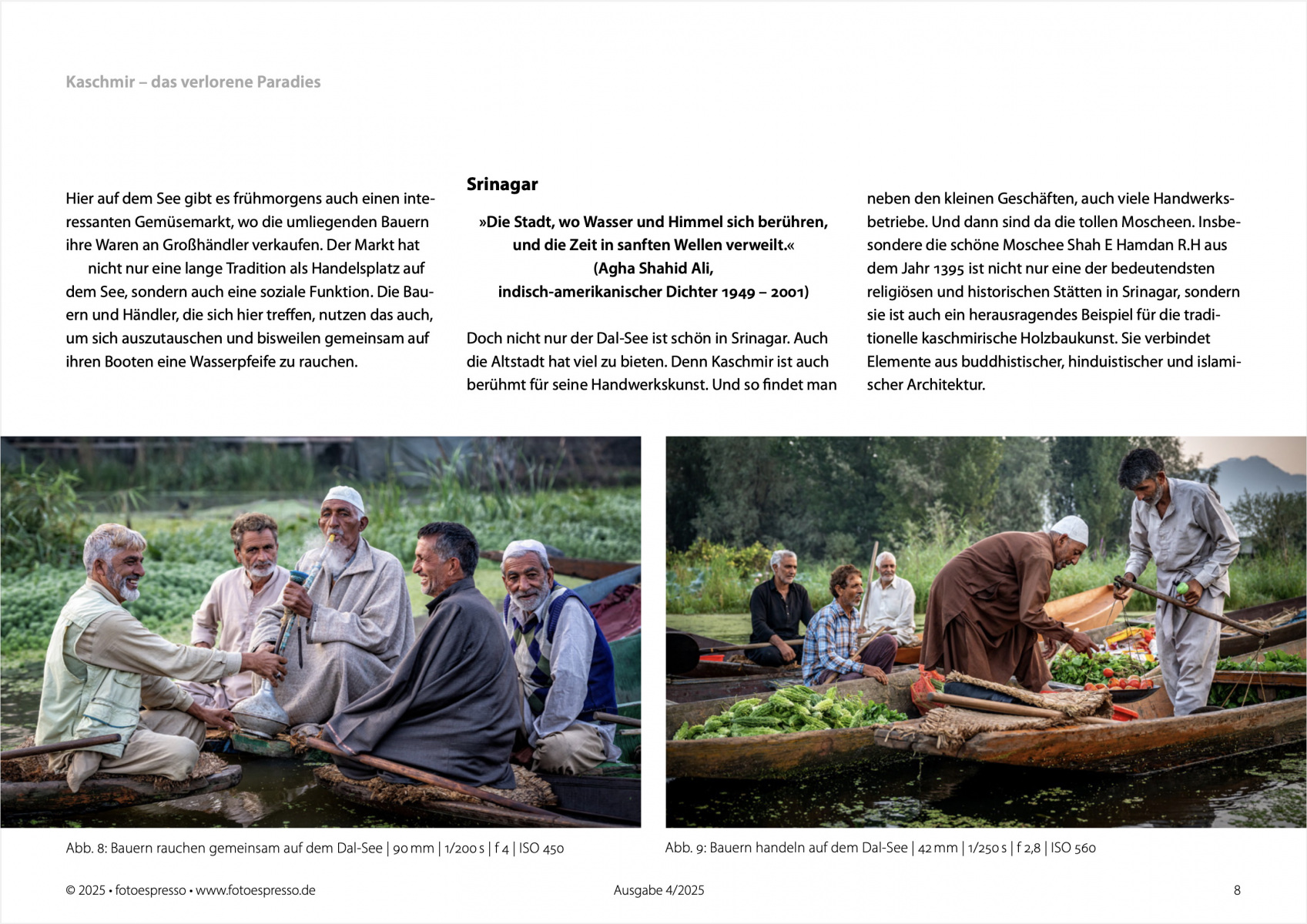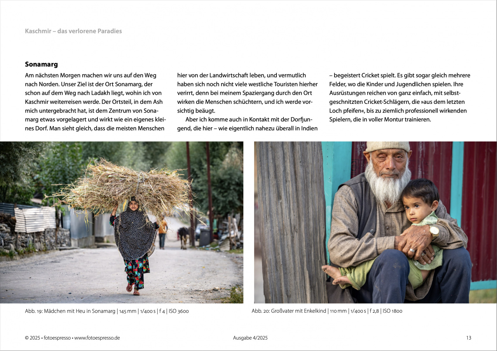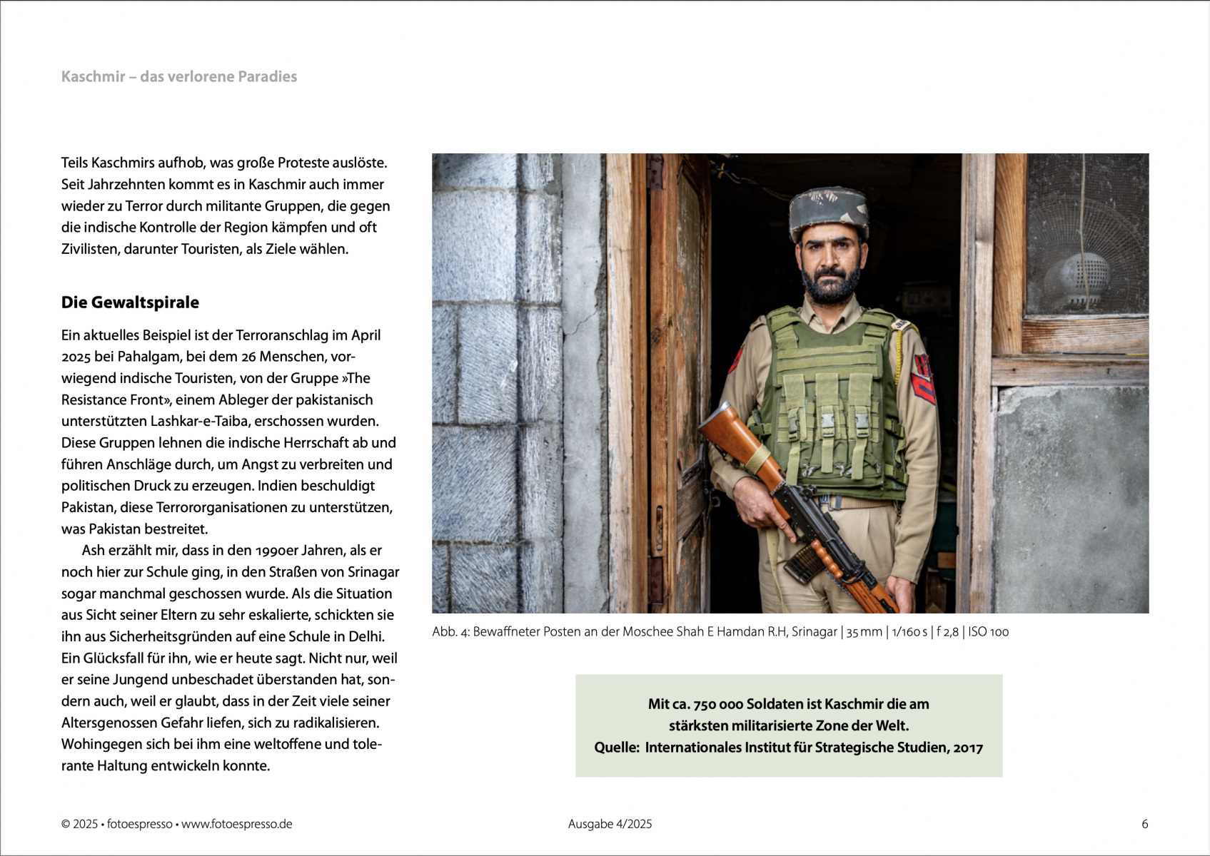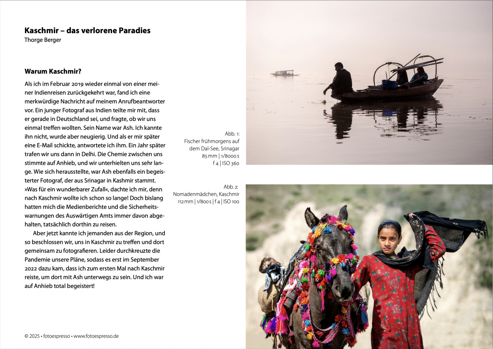 Heute erschienen: Meine neue Fotoreportage „Kaschmir – Das verlorene Paradies“ ist die Titelgeschichte in der neuen Ausgabe des Fotoespresso (4/2025) geworden. Die Story umfasst 15 Seiten und 31 Fotos (inklusive Titelbild). Ich bin sehr froh und stolz, mal wieder so eine umfangreiche Reportage machen zu können.