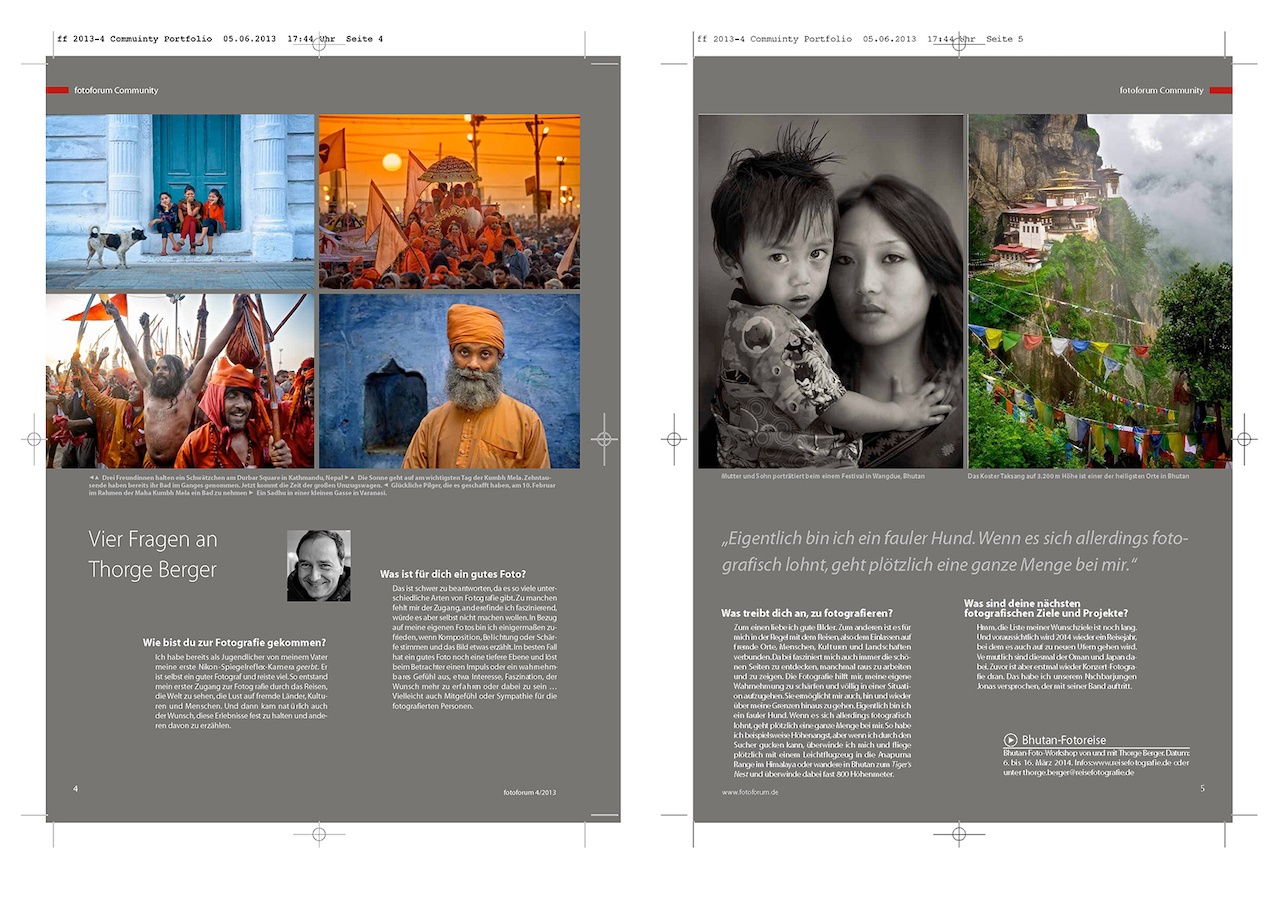 Eine wundervolle Entdeckung sind für mich auch die Bilder, die Thorge Berger aus der fotoforum Community ab Seite 28 zeigt. Seine Fotografien aus Bhutan, Indien und Nepal sind, nicht nur im übertragenen Sinne, ganz großes Kino. Auch seine Bildsprache erinnert bisweilen an Inszenierungen aus farbgewaltigen cineastischen Epen. Die feine Beobachtung und die kontemplative Komposition aus Form, Fläche, Linie, Raum und Farbe sind sein Metier.“